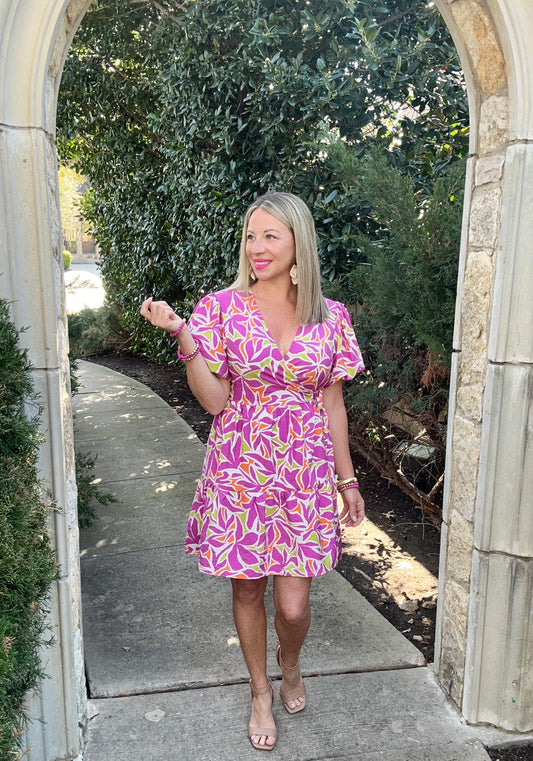 Regular price $58.00Regular priceUnit price / perSale price $58.00Flirty, fun, and effortlessly stylish—the Penelope Pink Wrap Mini Dress is your new go-to for any occasion. Featuring a playful allover print, a flattering wrap silhouette, and breezy short sleeves, this dress is perfect for everything from brunch... -