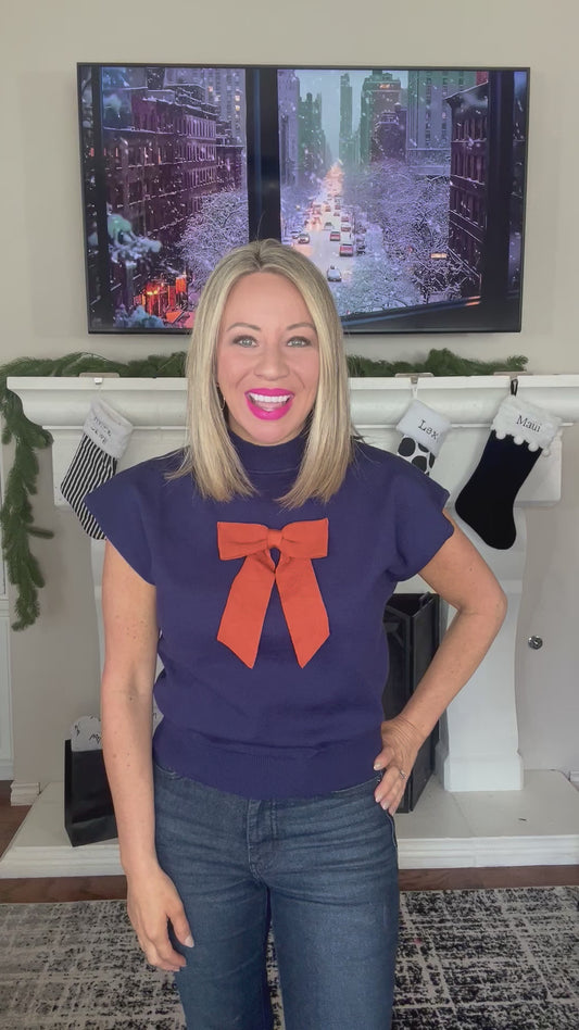 Regular price $58.00Regular priceUnit price / perSale price $58.00This adds a playful yet polished touch to your wardrobe. Featuring a chic mock neck and statement bow accents, this sweater effortlessly blends classic style with a modern twist. The bold navy and orange color combo makes it a standout choice, pe...