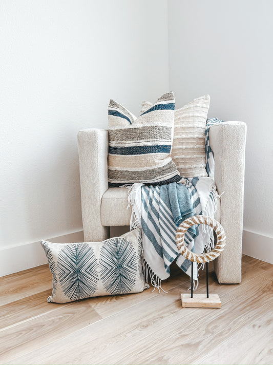 Regular price $44.00Regular priceUnit price / perSale price $44.00This stunning Coastal Striped Throw Blanket is made with a quality cotton blend, adding softness and comfort to your décor. The design features multiple stripes of different sizes, which bring a textured note. The tasseled edges are the perfect fi...Sold out -