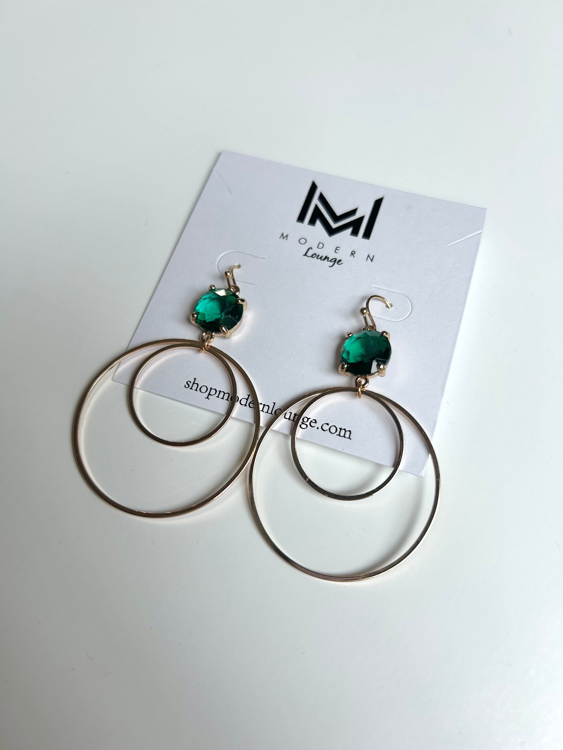 Elegant and eye-catching, the Emerald Dangles bring just the right mix of sparkle and sophistication. Featuring a radiant emerald gemstone paired with sleek gold circles that move beautifully with every step — these earrings make any outfit shine.