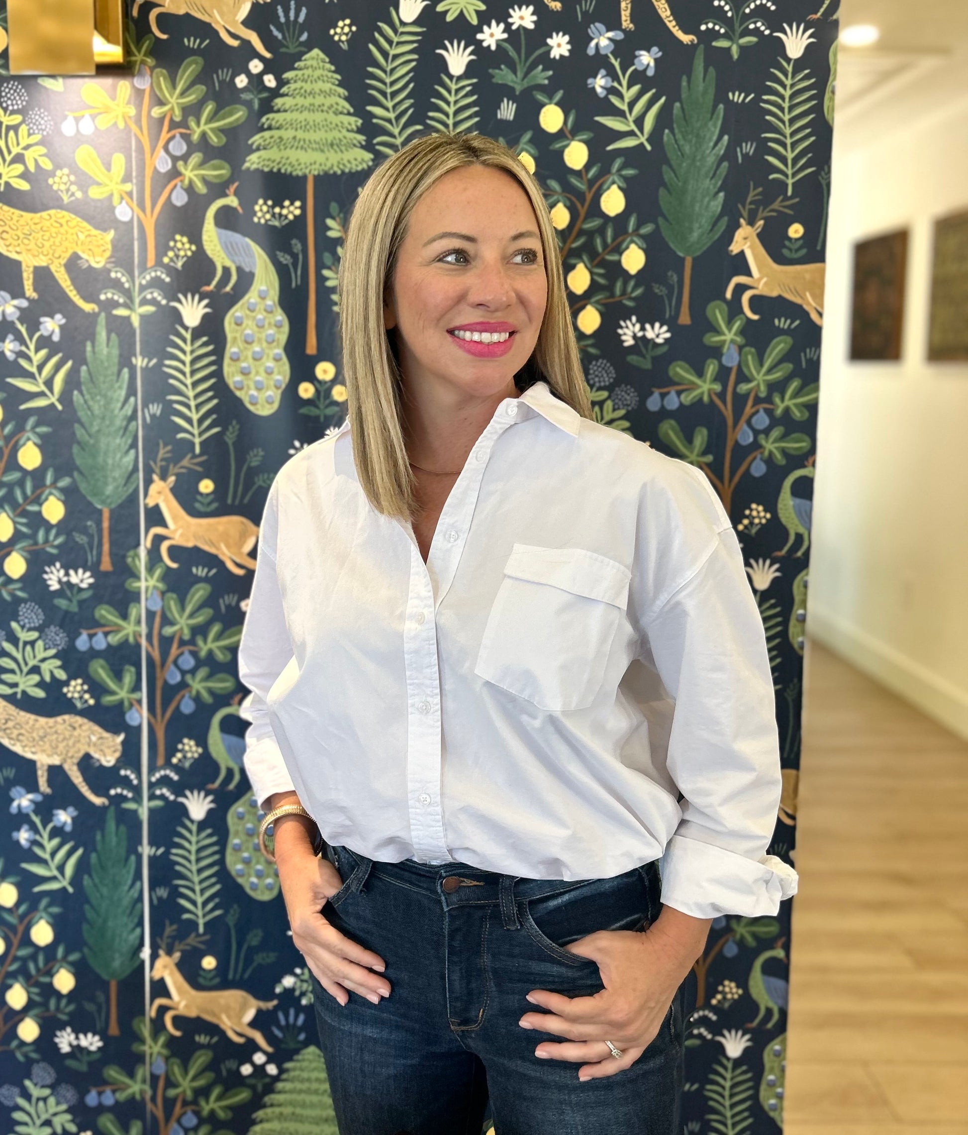 Elevate your wardrobe with our White Button-Down Top, the ultimate combination of timeless style and modern minimalism. Designed for versatility, this crisp white shirt features a relaxed yet tailored fit that flatters every silhouette. Crafted from soft, breathable fabric, it is perfect for layering or wearing solo. Whether paired with sleek trousers for the office, distressed denim for a casual day out, or layered under a blazer for a polished finish, this shirt is a true essential you reach for again and again. Simplify your style with a piece that effortlessly chic and endlessly wearable.