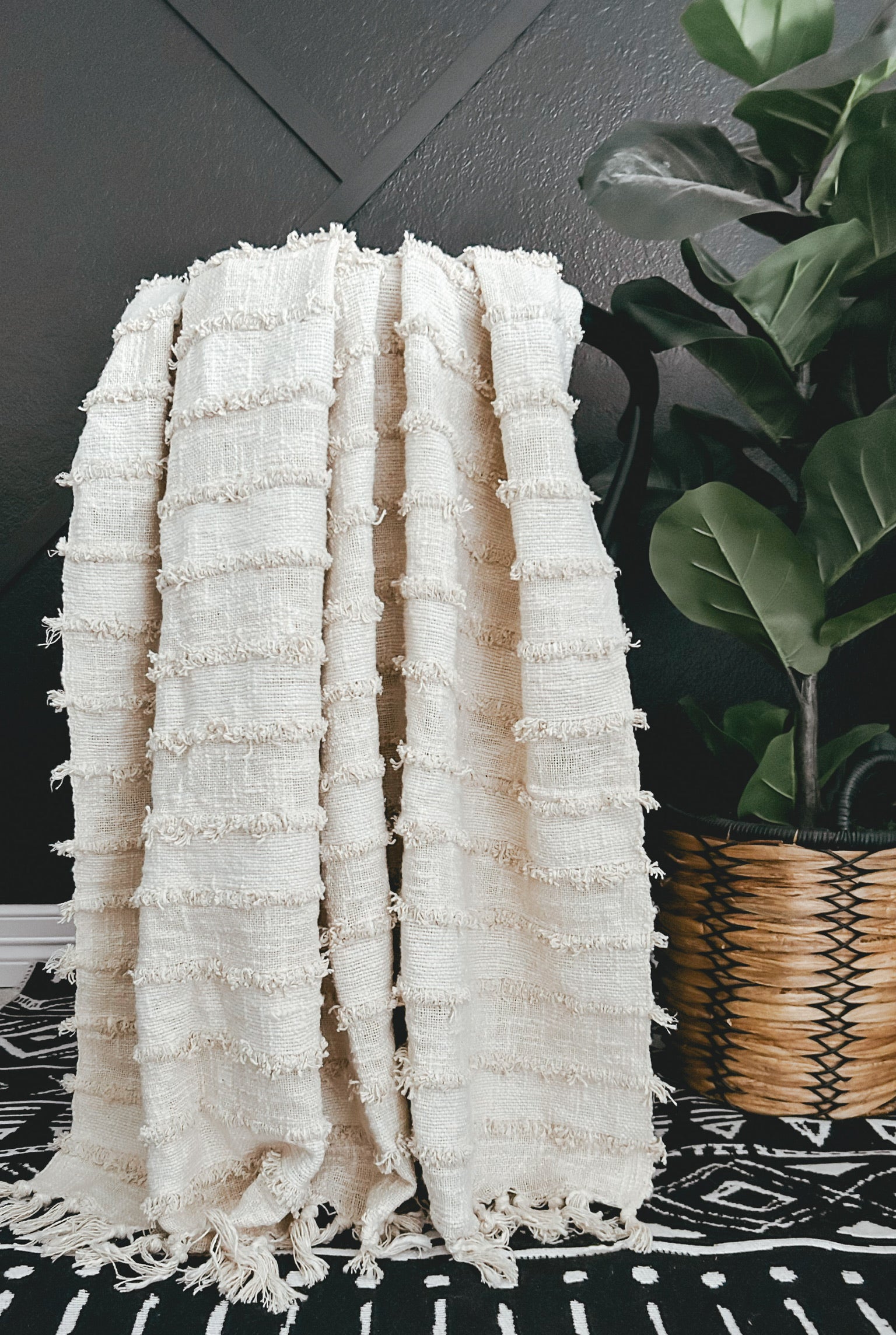Featuring a light, natural color design, this stylish Fringe Throw Blanket is easy to coordinate with a wide range of accent pieces to work with any existing décor. It brings soft color and beautiful texture to your sofa or any seating area. Made with 100% cotton, it's soft and cozy. This blanket will bring Zen to your favorite space!